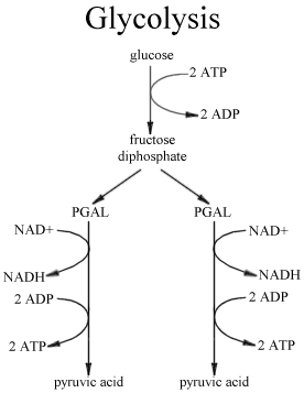 - 1) A glucose molecule is split into 2 PGAL molecules by the oxidation of 2 ATP (Energy investment)