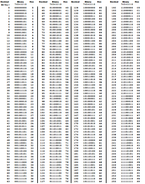 - convert positive denary whole numbers (0-255) into 8-bit binary numbers and vice