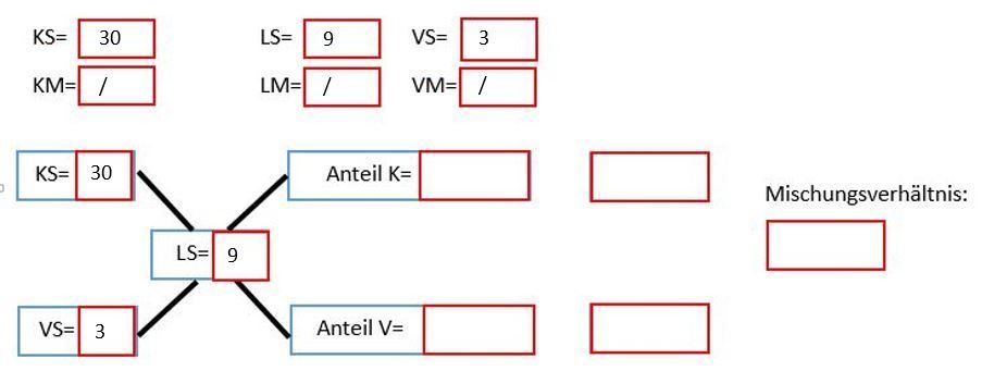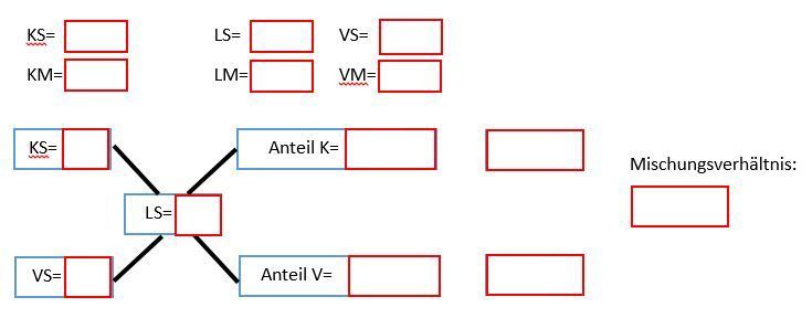Die Konzentratmenge und die Verdünnungsmenge (VM) ergeben dann die Lösungsmenge: ( KM, KS ) + ( VM, VS ) = ( LM, LS, KM )
