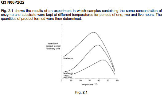 (b) Explain why the optimum temperature is lower if the quantity of product formed is measured after five hours rather than one hour. [2]