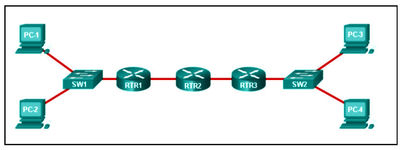 A packet leaving PC-1 has to traverse “_____” hops to reach PC-4.
