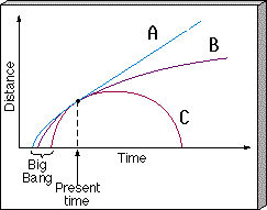 16. The diagram to the right is a plot of time (on the x axis) vs. the distance between any two galaxies in the Universe (on the y axis) for three different Universes: Universe A, Universe B, and Universe C. Which of the three Universes in the above diagram has the highest density of matter?