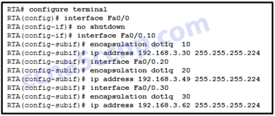 RTA is using the same subnet for VLAN 20 and VLAN 30.
