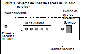 Una [blank_start]línea de espera[blank_end] es un sistema al que llegan de vez en cuando clientes desde el medio ambiente, para que se les proporcione un cierto servicio a través de uno o varios servidores. El tiempo entre llegadas y el tiempo que toma el servicio suelen ser aleatorios.