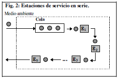 cuando los clientes requieren pasar por dos o más estaciones de servicio, una por una, para completar su servicio,