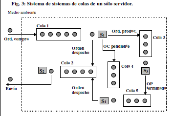 La Fig.3 muestra el diagrama de un sistema de sistemas de colas simplificado, para un sistema de procesamiento de órdenes de compra de una empresa.Cada subsistema de cola tiene un sólo servidor.