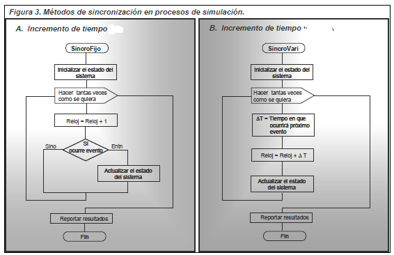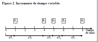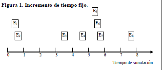>>>>>>>En la figura 2, el reloj avanza desde el tiempo 0 hasta el tiempo 1, en el que ocurren el evento E1. Una vez actualizado el estado del sistema, el reloj avanza de una vez hasta el tiempo 4, donde ocurre el siguiente evento E2; y así sucesivamente.