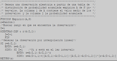 Para simular una distribución de probabilidad acumulada empírica partimos de los pares ordenados <Yi,Ai> de la tabla 4. Los pares ordenados se almacenan en un arreglo A de dos columnas y de N filas. N es el número de intervalos observados. De cada intervalo Yi, en la columna 1 se guarda su valor medio y en la columna 2 la probabilidad acumulada Ai.