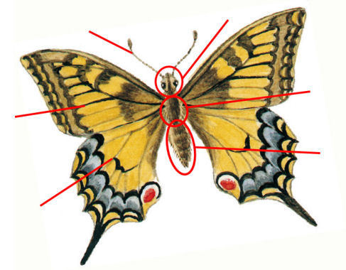 Benenne die einzelnen Körperteile des Schmetterlings.