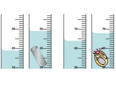 Two graduated cylinders are filled with the same amount of water; then a metal rod is dropped in one and a ring in the other. Using the picture, what conclusion can you make about this experiment?
