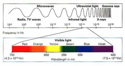 Refer to the diagram to the left. Which statement is a correct comparison of the red color to the violet color in the visible light portion of the electromagnetic spectrum?