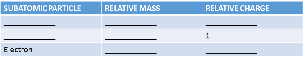 Fill in the table to complete the relative masses and charges of subatomic particles.