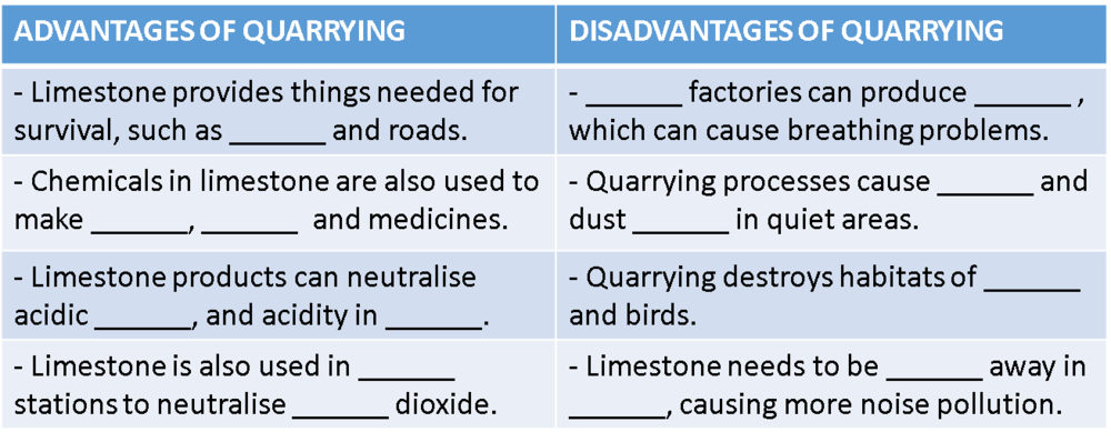 Fill in the blanks to complete the table showing the advantages and disadvantages of quarrying.