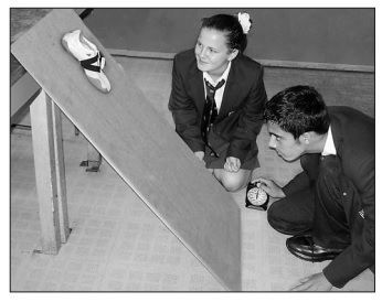 Pupils investigate the time taken for different types of trainer to slide down a ramp.