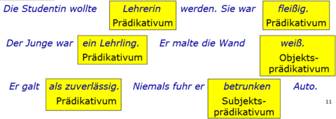 | Prädikativum | 1) Prädikative mit Kopulaverben (sein, werden, bleiben) 2) Bezug auf Subjekt oder Objekt |
