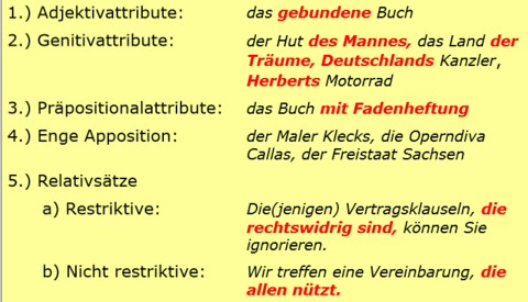 | Adverbiale | 1) temporale Adverbiale (Zeit) "Wann" "Wie lange" "Wie oft" 2) lokales Adverbial (Ort) "Wo" "Wohin" 3) modales Adverbial (Art und Weise) "Wie" 4) kausales Adverbial (Grund) "Warum" a) final (Zweck) b) konditional (Bedinung) c) konzessiv (Gegengrund) d) konsekutiv (Folge) |