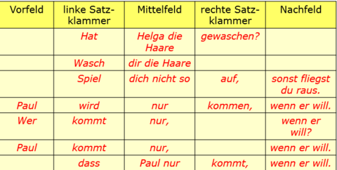 | Satzarten | 1) Deklarativsatz (Aussagesatz) 2) Interrogativsatz (Fragesatz) 3) Imperativsatz (Aufforderungsatz) 4) Desiderativsatz (Wunschsatz) 5) Exklamativsatz (Ausrufesatz) |