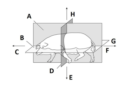 | What is the transverse plane? | The transverse plane is a plane across the body that divides it into the cranial (head-end) and cadual (tail-end) parts that may not be equal. |