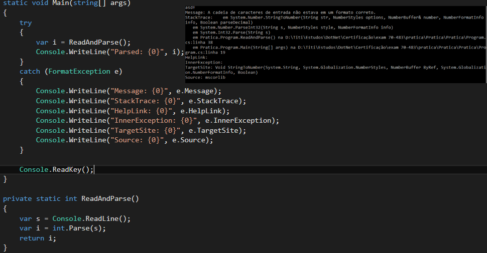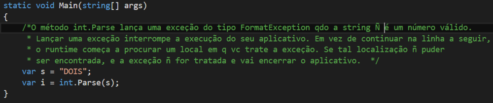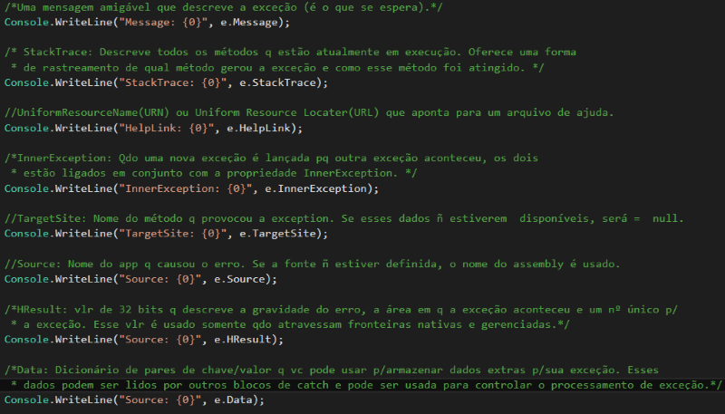 | O que é uma Exception no .Net? | Uma exceção é um objeto, que contém dados sobre o erro que aconteceu. Ele ñ só tem uma mensagem amigável para o usuário, mas tb contém o local em q o erro aconteceu e pode até armazenar dados adicionais, como um endereço p/ uma página que oferece alguma ajuda. |