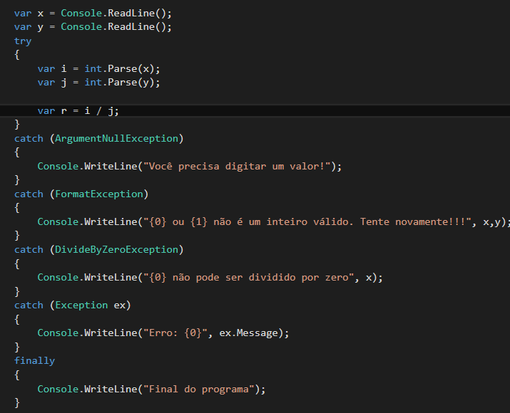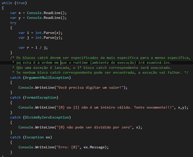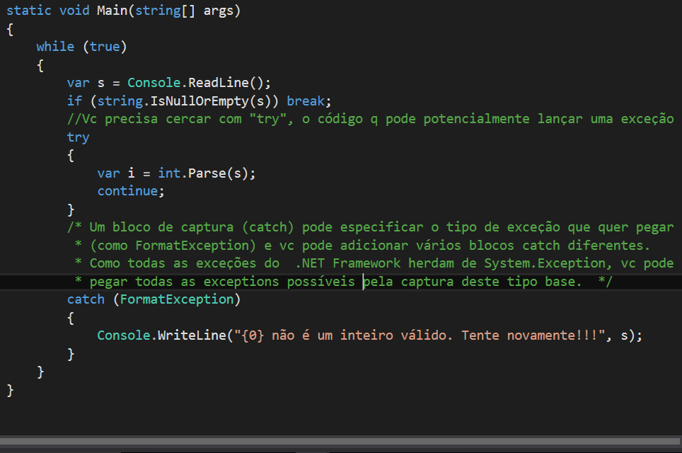 | pode ter catch vazio? Sem uma Exception? | Em C#1, vc tb podia usar um bloco catch sem um tipo de Exception. Isto poderia ser usado p/ capturar exceções q foram lançadas de outras linguagens como C++ q não herdam de System.Exception (em C ++ você pode lançar exceções de qualquer tipo). Hoje em dia, cada exceção que não herda de System.Exception é empacotada automaticamente em um System.Runtime.CompilerServices.RuntimeWrappedException. Dado q esta exceção herda de System.Exception, ñ há necessidade p/ bloco catch vazio mais. |