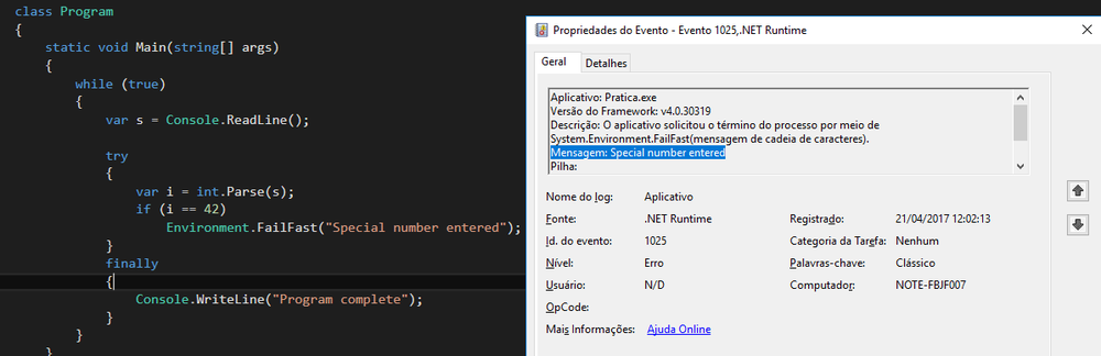 | e se não quisermos passar pelo finally e ao invés disso, quisermos encerrar a app? | Environment.FailFast: pode ter uma situação em que encerrar o aplicativo é mais seguro do que executar blocos finally. Este método tem duas sobrecargas diferentes, um que recebe uma string e um outro que recebe uma exceção. Quando este método é chamado, a mensagem (e, opcionalmente, a exceção) são gravados no log de eventos do aplicativo do Windows, e o aplicativo é encerrado |
