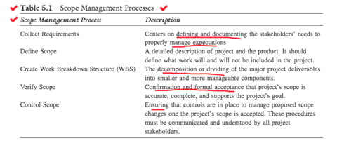 | Why is it important to define the project’s scope accurately and completely? | a project’s scope defines all the work, activities, and deliverables that the project team must provide in order for the project to achieve its MOV. It is an impor-tant step in developing the project plan since one must know what work must be done before an estimate can be made of how long it will take and how much it will cost. clear definition of the project’s deliverables sets unambiguous expectations and agreement among all of the project stakeholders. |