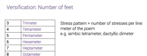 | foot / feet | smallest unit of verse The unit is composed of syllables |
