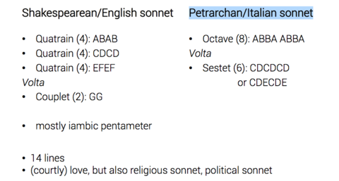 | The Sonnet Shakespearean/English sonnet vs. Petrarchan/Italian sonnet rhyme scheme? how many lines? theme? | |
