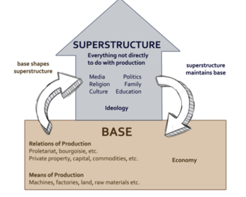 | Marxist approach diagram economic base & ideological superstructure | economic base & ideological superstructure: “how certain organisations of labour and materials affect and are affected by institutions” (law, religion, education, media, state) -to interpret cultural products is to relate them back to base |