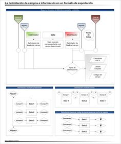 Para lograr trasladar no sólo la estructura sino un contenido o información de origen, existen múltiples formas de representar y delimitar los datos, los campos que los contienen y en definitiva la estructura completa original. A menudo en los sistemas de automatización se desarrollan formatos propios, que plantean una codificación en la delimitación que reviste en algunos casos de gran complejidad. Esto se debe no sólo a cuestiones operativas, sino también comerciales y de protección de los sistemas de gestión que se desarrollan, evitando la operatividad de un centro bibliotecario, archivo, centro de documentación o museo, para poder transformar y manipular la información que originalmente creo y alimento en el sistema. Esta situación que puede llegar a ser paradójica, es real y limita sobremanera las operaciones de estudio estadístico de la colección bibliográfica y su circulación, de la gestión archivística y la tramitación de los expedientes y sus seguimientos, etc. Otros problemas que puede causar un formato de exportación no normalizado o convenido para su compatibilidad con otras herramientas de tratamiento de la información, es la limitación en el desarrollo de catálogos y publicaciones de referencia que tradicionalmente el documentalista y el archivero llevan a cabo con meridiana frecuencia; entre otros muchos motivos.Conocida la problemática y la importancia de confeccionar formatos de migración o exportación de datos bien diseñados, se debe explicar como edificarlos convenientemente atendiendo a su casuística y diagnóstico general. Según se muestra en el gráfico de delimitación de campos e información, es obligado establecer minimamente dos delimitadores que correspondan al inicio y al final de un dato o un campo. De esta forma, cualquier PARSER o analizador de datos, es capaz de seguir un patrón sencillo de la codificación que se ha establecido para el formato de exportación correspondiente. A su vez es necesario establecer un delimitador que diferencia el inicio y el final de cada registro. Téngase en cuenta que un registro puede tener múltiples campos y múltiples datos, por lo que si se desean representar todos los datos de un registro bibliográfico o las descripciones de un expediente administrativo, se requiere obligatoriamente diferenciar la separación entre los diferentes asientos de la tabla.Todos los separadores responden al esquema presentado, por lo que se observará siempre que la delimitación de datos y campos de un registro y a la postre de una tabla, mantienen un concepto de anidamiento singular.