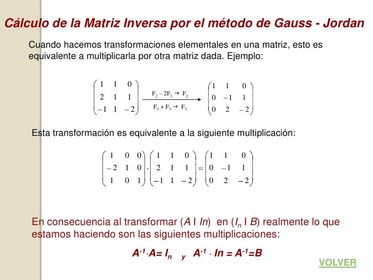 Propiedades (asociativa, elemento neutro, conmutativa y distributiva del producto respecto de la cima.Matriz inversa: El producto de una matriz por su inversa es igual . Rango de una matriz: Es el numero de lineas de esa matriz ( filas o columnas ) que son linealmene in dependiente.Métodos de Gauss: Consiste en hacer transformaciones elementales en las filas de la matriz para llegar a obtener la matriz identidad.Se llama transformación elemental en una matriz a: T1) multiplicar o dividir una fila por un numero real distinto de cero.T2) sumar o restar a una fila otra multiplicada por un numero real no nulo.T3 ) intercambiar el lugar de 2 filas entre si.