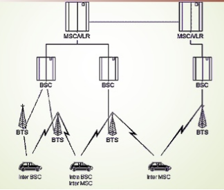 Caption: : Tipos de traspasos Dentro del sistema GSM, hay cuatro tipos de traspaso que se pueden realizar sólo para sistemas GSM -Intra-BTS handover Inter-BTS handover Intra BSC -Inter-BSC handover -Inter-MSC handover
