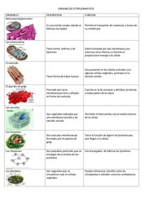 Las principales organelas (u orgánulos) son:Mitocondrias, usina energética donde la energía almacenada en los enlaces de los hidratos de carbono se convierte en energía útil para la célula, en forma de ATP.Cloroplastos, componente de las células vegetales donde se realiza la fotosíntesisRetículo endoplasmático (RE): sistema de canales membranosos que pueden o no estar tapizados ribosomas, que son partículas de ARN y proteínas.Aparato de Golgi: pilas de sacos membranosos que modifican las proteínas y los lípidos, sintetizan carbohidratos y empacan moléculas para su transporte