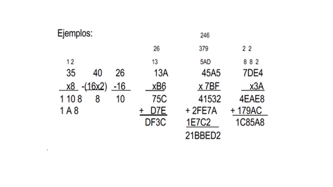 PARA REALIZAR ESTAS OPERACIONES HAY QUE TENBER EN CUENTA LOS SIGUIENTES VALORES (0,1,2,3,4,5,6,7,8,9) A=10 , B=11 , C=12, D=13 E=14 y F=15 SUMA DE HEXADECIMAL Para realizar la suma de hexadecimales se empieza a sumar como una suma normal , luego si se encuentra con numeros mayores que 9 remplazar con las letras hasta el valor de "F" o a la vez que resulte un numero mayor que (15=F) se le resta 16 y la respuesta se le agrega como respuesta