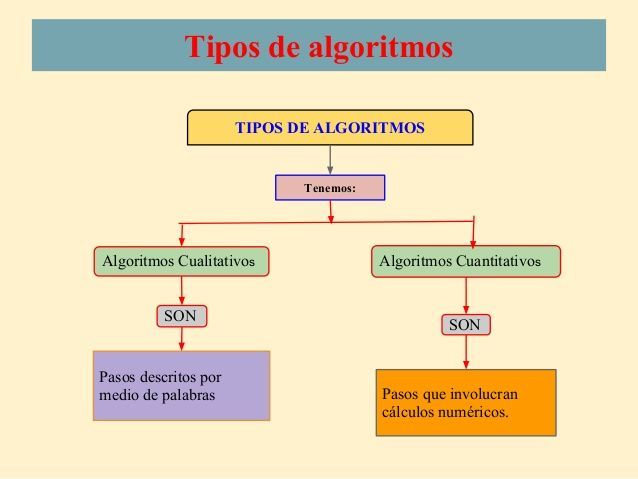 Algoritmo computacional: Refiere al tipo de algoritmo que puede realizarse por medio de un ordenador. Algoritmo cualitativo: Refiere al tipo de algoritmo que no realiza cálculos numéricos, mas bien sigue determinadas instrucciones y pasos descritos a través de palabras que llevan a la solución de un problema. Algoritmo no computacional: Es del tipo de algoritmo que para ser ejecutado no necesita de un ordenador. Algoritmo cuantitativo: Refiere al algoritmo que incluyen cálculos numéricos al seguir sus pasos y las instrucciones que le llevarán a resolver determinados problemas. Algoritmos de búsqueda: Se baja en encontrar un elemento determinado dentro de una lista ingresada, el cual deberá cumplir ciertas condiciones. Algoritmo de ordenamiento. Algoritmo de encaminamiento: Refiere a los algoritmo que siguen una serie de pasos que se mantienen encadenados para llegar a transmitir algo. Algoritmos probabilísticos: Estos no dan respuestas exactas, donde sus respuestas solo son aproximaciones ante determinados problemas, a su vez las soluciones que obtienen pueden tanto ser correctas como incorrectas. Algoritmo numérico: estos dan una respuesta próxima al problema. Algoritmo de las Vegas: estos ofrecen una respuesta correcta, y si existe algún fallo en los cálculo lo informa. Algoritmo de Montecarlo: refieren a los algoritmos que pueden dar respuestas correctas o con una probabilidad muy baja. Algoritmo heurístico: Este algoritmo para llegar a los resultados de un problema o a una solución en especial deja atrás ciertos objetivos. Los mismos se emplean cuando las vías tradicionales no ofrecen una solución. Son empleados cuando no existe una respuesta óptima aun dadas ciertas restricciones. Algoritmo determinista: Este algoritmo es lineal y a la vez predictivo, solo si reconoce sus entradas y la manera en que procederá. Algoritmo no determinista: Refiere a los algoritmos que presentan un comportamiento en forma de árbol. Algoritmo voraz: Este algoritmo busca obtener un resultado óptimo y definido de un problema determinado, para ello elige la solución mas adecuada.