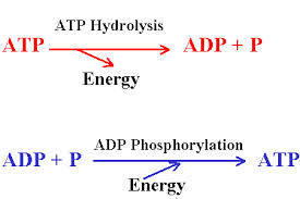 | How does ATP store its energy? | 1)ATP has 3 phosphate groups which makes the molecule unstable and so have a low A.E (therefore easy to break) 2)When they do break energy is released ATP+H2O→ADP+Pi As water is used, its a hydrolysis reaction |