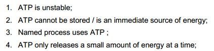 | Why is ATP a better immediate source of energy than glucose? | -The hydrolysis of ATP to ADP is a single step reaction that releases immediate energy - Each ATP molecule releases less energy than each glucose molecule. Therefore, the energy for reaction is released in smaller, more manageable quantities. so it releases small amounts of energy |