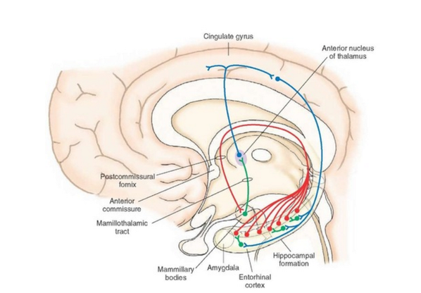 | Circuito de Papez: Conecta los cuerpos mamilares con el núcleo anterior y lateral dorsal del tálamo, por medio del tracto mamilotalámico, después al giro cingulado y la corteza entorrinal, para finalmente llegar de nuevo al hipocampo. | |