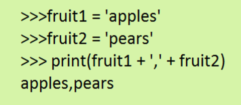 | Create 2 strings with the values 'apples' and 'pears'. Print both strings out on the same line, with a comma between them |