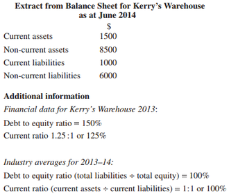 | Q-20 Which of the following statements is true about gearing for Kerry’s Warehouse in 2014? (A) It is better than industry average and has improved since 2013. (B) It is better than industry average and has worsened since 2013. (C) It is worse than industry average and has improved since 2013. (D) It is worse than industry average and has worsened since 2013. | (D) It is worse than industry average and has worsened since 2013. |