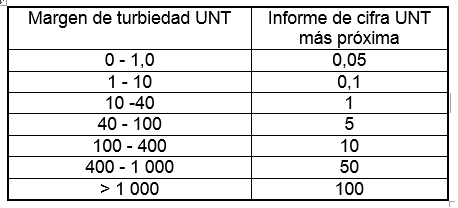 | Unidades nefelométricas de turbiedad (UNT) | Son las unidades en que se expresa la turbiedad cuando ha sido determinada por el método nefelométrico. |