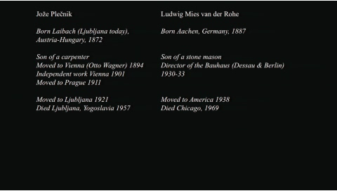 | einwenig älter als Mies, beide Kinder des späten 19JH Sohn eines Schreiners, Handwerkssohn beide Lehrer Plecnik gleichen Ort geboren und gestorben, aber viele Wechsel: Ungarn, 1Weltkrieg, Jugoslawien, 2 Weltkrieg, letztes Projekt Pavilion für Tito | |