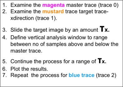 | Cross - correlation based coherence - sensitive to waveform - operates in 3 neighbouring traces (2 targets, 1 master) - value = 1 = high coherence | |