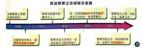 | 為什麼英法再次(在「第二次鴉片戰爭」)發兵? | 因為中國拒絕英法憑條約獲取更多特權,因此英法決定用武力達到目的。 |