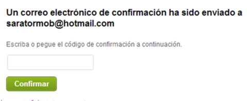 | 3) Luego entra en el correo copia el código y lo pega en el recuadro. Hacer clic a CONFIRMAR para seguir. |