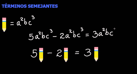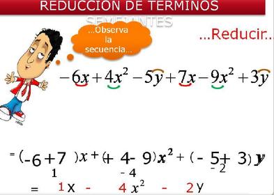 | REDUCCIÓN DE TÉRMINOS SEMEJANTES | En una expresión algebraica se llaman términos semejantes a todos aquellos términos que tienen igual factor literal, es decir, a aquellos términos que tienen iguales letras (símbolos literales) e iguales exponentes. EJEMPLOS: |