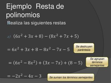 | OPERACIONES CON POLINOMIOS SUMA RESTA MULTIPLICACIÓN DIVISIÓN | Suma: operación más sencilla, al reducir términos semejantes se suma. |