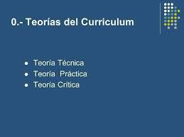 | Tema: Las Teorías Curriculares mas conocidas. Definición: Tres son las teorías curriculares que señala Kemmis, (1988) como principales: *La Teoría Técnica, *La Teoría Práctica y *La Teoría Crítica, Comentario Personal: Estos tres enfoques teóricos se diferencian sustantivamente en la manera de entender la ubicación cultural y social de la educación y de la escolarización. | |