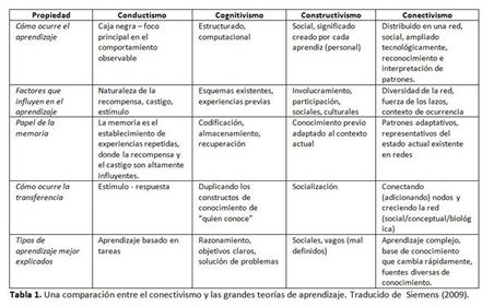 | Comparación del conectivismo y otras teorías de aprendizaje | A diferencia del conductismo, el contructivismo y aun el construccionismo, el conectivismo reconoce que hay un aprendizaje creado colectivamente y almacenado en máquinas en lugar de cerebros individuales. |