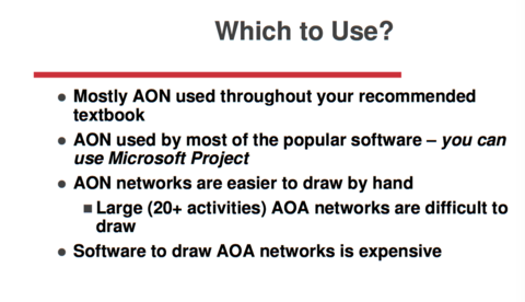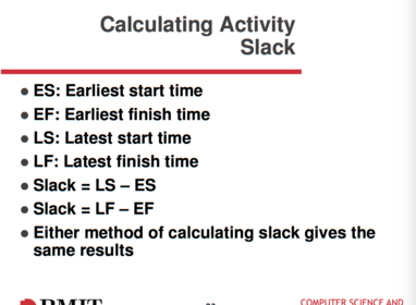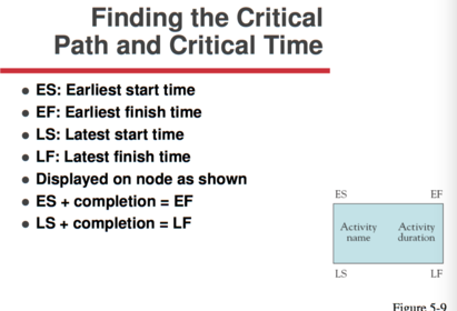 | - But project network diagrams also provide valueable information about the logical sequnce and dependencies among the various activities and tasks - Also, a completion date or project deadline should be developed based on a sound estimate pricess rather than guesstimating a target date or a randomly set date - They also provide info concering when specific tasks must start and finish, and what activities may be delayed without affecting the deadline - PM can make decisions regarding scheduling and resource assignments to shorten the time required for those critical activities thatt will inpact the project deadline - Critical path is calculated using the network diagram | The language of critical path anaysis: - Activity - task or a set of tasks, uses resources and time - Event - identifiaible state resulting from completion of one or more activities. Consumes no resource or time, predecessor activties must be completed. - Milestone- identifiable and noteworkthy events that mark significant progress - Network - dirgram of (activties) and arrorws (directions) that show the relationaship of activities -Path - a series of connected activities betwen 2 events - Criticial path - set of activities on a path that if delayed will delay the completion date of project - Critical time - time required to complete all activties on the critical path |